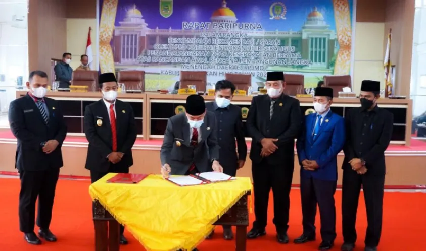 Indonesiainteraktif.com, Rokan Hilir - Dewan Perwakilan Rakyat Daerah (DPRD) Kabupaten Rokan Hilir (Rohil) menggelar rapat Paripurna dalam rangka penyampaian rekomendasi atau saran oleh DPRD Kabupaten Rokan Hilir sekaligus penandatanganan nota kesepakatan bersama (MoU) atas rancangan awal rencana pembangunan jangka menengah daerah (RPJMD) Kabupaten Rokan Hilir Tahun 2021-2026, Senin (16/08/2021).