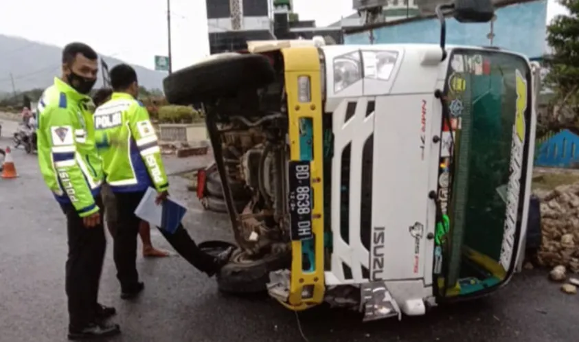 Indonesiainteraktif.com, Lebomg - Elak kendaraan jenis sepeda motor yang melaju searah, kendaraan truk Isuzu Warna Kuning Nomor Polisi BD 8638 DH yang dikemudikan Panji Suprastio (22) Warga Kecamatan Padang Jaya Kabupaten Bengkulu Utara dilaporkan mengalami kecelakaan tunggal, Senin (16/05/2022).