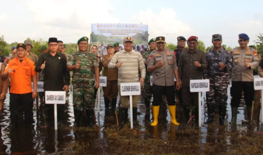 IndonesiaInteraktif.com - Sebagai wujud nyata menjaga dan terus melestarikan ekosistem hutan mangrove di kawasan pesisir pantai Bengkulu, Gubernur Bengkulu Rohidin Mersyah bersama jajaran TNI/Polri, Forkopimda dan semua elemen masyarakat melakukan penanaman 1000 bibit mangrove bersama, dengan areal tanam seluas 1,2 Ha, di kawasan Pulau Baai, Senin (15/5/2023).
