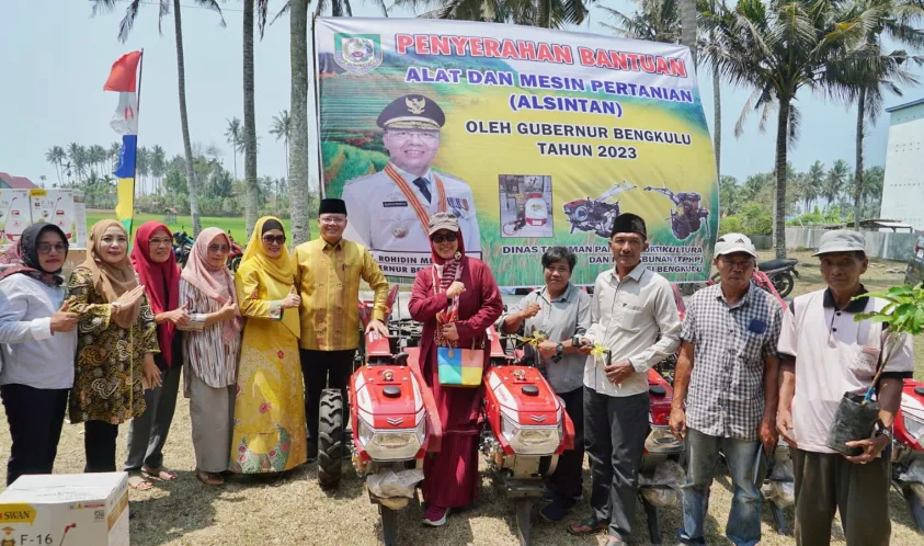 IndonesiaInteraktif.com, Bengkulu -- Sebagai upaya mendorong peningkatan produktivitas pertanian, Gubernur Bengkulu Rohidin Mersyah menyerahkan bantuan alat mesin pertanian (Alsintan) kepada Kelompok Tani di Kabupaten Kaur, berlokasi di Desa Jembatan Dua Kecamatan Kaur Selatan, Ahad (08/10).