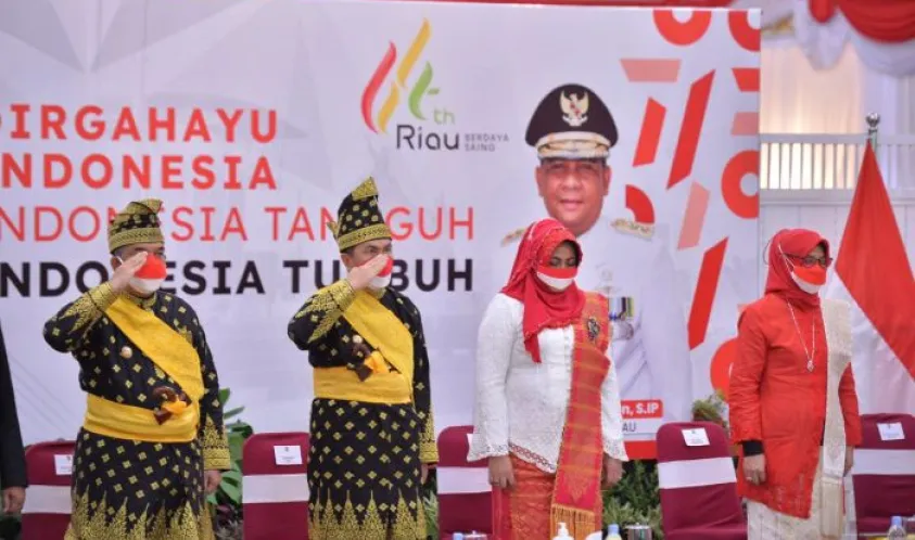 Indonesiainteraktif.com, Riau - Gubernur Riau (Gubri) Syamsuar mengikuti upacara peringatan detik-detik Proklamasi dalam rangka Hari Ulang Tahun (HUT) ke-76 Republik Indonesia (RI) secara virtual bersama Presiden RI Joko Widodo di Gedung Daerah Balai Serindit, Selasa (17/08/2021).