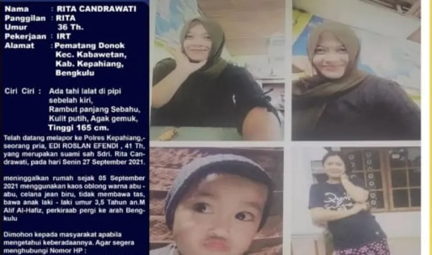 Indonesiainteraktif.com, Kepahiang - Informasi orang hilang kembali diterima Kepolisian Daerah Bengkulu. Kali ini informasi diterima langsung oleh polres Kepahiang Polda Bengkulu. Rita Candrawati (36) Ibu Rumah Tangga (IRT) dan anakny M. Alif Al-Hafiz(3,5) yang beralamat di Dsa Pematang Donok kecamatan Kabawetan kabupaten Kepahiang dilaporkan sejak Senin 27 September 2021 hilang.