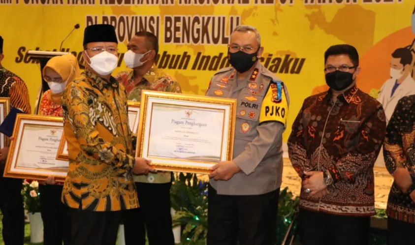 Indonesiainteraktif.com, Bengkulu - Malam Puncak Hari Kesehatan Nasional Ke-57 Tahun 2021 Provinsi Bengkulu, Kapolda Bengkulu Irjen Pol Drs. Guntur Setyanto, M.Si., menerima penghargaan Gubernur Bengkulu atas dedikasi dan dukungan aktif dalam penanganan Covid 19 dan percepatan pelaksanaan Vaksinasi Covid-19 di Provinsi Bengkulu tahun 2021.