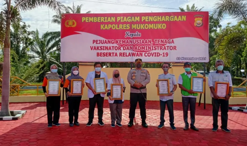 “Kami menyampaikan terima kasih kepada para pejuang kemanusiaan, tenaga vaksinator, dan administrator beserta relawan COVID-19 di daerah ini yang telah membantu melawan pandemi selama ini,” kata Kepala Kepolisian Resor Kabupaten Mukomuko AKBP Witdiardi.
