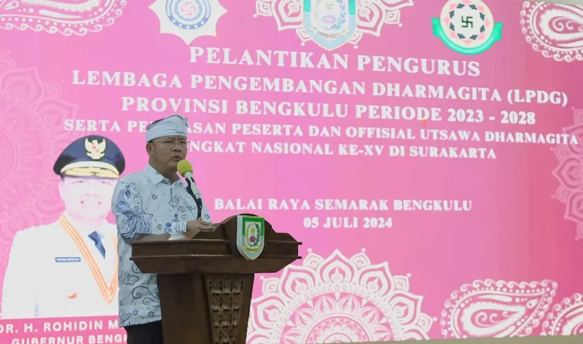 Pelantikan Pengurus Lembaga Pengembangan Dharna Gita (LPDG) Provinsi Bengkulu periode 2023-2028 dan Pelepasan Peserta serta Official Utsawa Dharma Gita (UDG) tingkat Nasional XV Tahun 2024 Kontingen Provinsi Bengkulu ke Surakarta dipimpin langsung oleh Gubernur Rohidin di Balai Raya Semarak Bengkulu, Jumat (05/07).