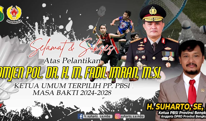 Indonesiainteraktif.com, Bengkulu -- Keseriusan H. Suharto, SE., MBA, Ketua Pengurus Provinsi (Pengprov) Persatuan Bulu Tangkis Seluruh Indonesia (PBSI) Provinsi Bengkulu dalam membina bulu tangkis sungguh luar biasa dan berbuah manis. Pada Musyawarah Nasional PBSI yang berlangsung di Yogyakarta (30/11/2024), H. Suharto, SE., MBA, Ketua Pengda PBSI Provinsi Bengkulu dapat amanah dan dipercayab sebagai Bendahara Dewan Pengawas PP PBSI Periode 2024 - 2028. Prestasi “Pak Suharto” ini sungguh luar biasa dan patut diberi acungan jempol.