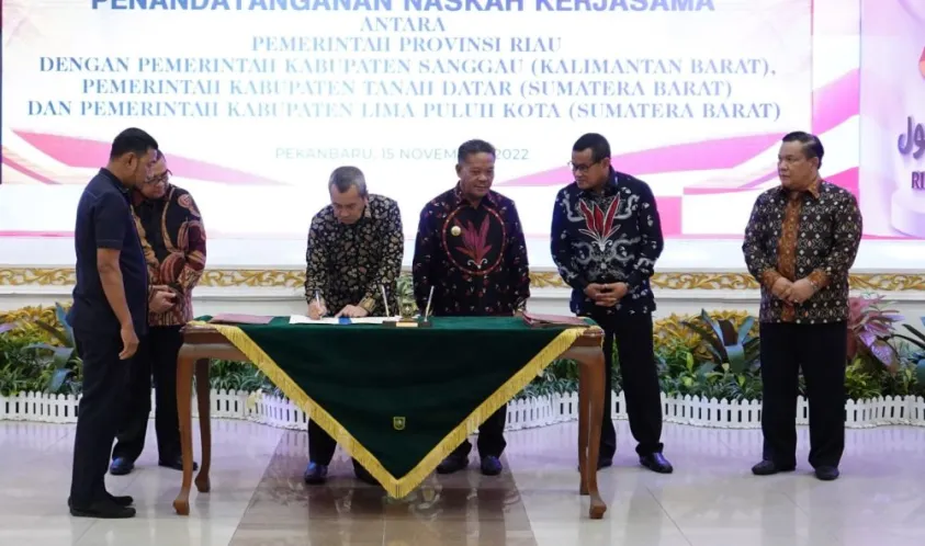 Penandatanganan dilakukan oleh Gubernur Riau (Gubri), Syamsuar dan Sekretaris Daerah (Sekda) Provinsi Riau, SF Hariyanto bersama dengan Bupati dan Sekda Pemkab Sanggau, Pemkab Tanah Datar, dan Pemkab Lima Puluh Kota.