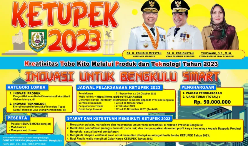 IndonesiaInteraktif.com, Bengkulu -- Pemprov Bengkulu melalui BAPPEDA Provinsi Bengkulu, di tahun 2023 ini kembali melaksanakan Lomba Inovasi Produk dan Inovasi Teknologi yang diberi nama KETUPEK 2023, yaitu singkatan dari “Kreativitas Tobo Kito Melalui Produk dan Teknologi”.
