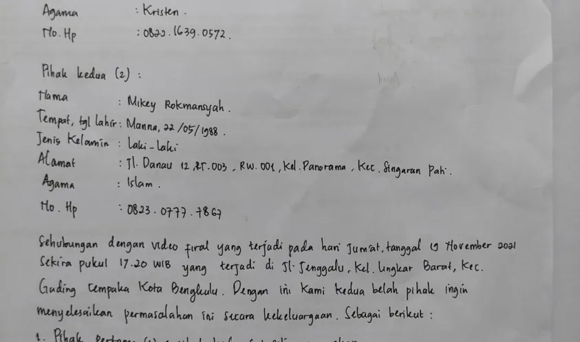 Dari mediasi yang dilakukan disepakati beberapa point antara kedua belah pihak diantaranya Pihak pertama dan pihak kedua saling memaafkan, pihak pertama dan pihak kedua akan membuat video klarivikasi atas video yang telah viral tersebut, Pihak pertama dan pihak kedua akan menyelesaikan permasalahan tsb secara kekeluaegaan serta tidak akan menuntut di kemudian hari.