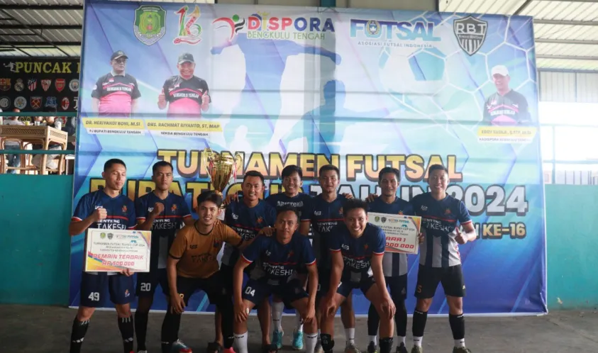 IndonesiaInteraktif.com, Bengkulu Tengah — Pemerintah Kabupaten Bengkulu Tengah melalui Asisten Bidang Perekonomian dan Pembangunan Eka Nurmaeni, S.E., M.Pd., menyerahkan hadiah berupa piala dan uang pembinaan kepada pemenang Turnamen Futsal Bupati CUP tahun 2024 dalam rangka memeriahkan HUT ke 16 Kabupaten Bengkulu Tengah.