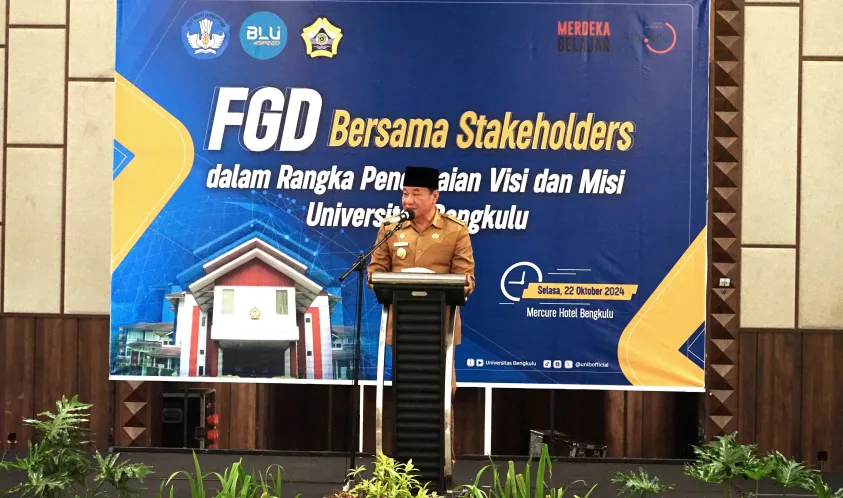 IndonesiaInteraktif.com, Bengkulu -- Dalam rangka mengevaluasi pencapaian visi dan misi Universitas Bengkulu menuju World Class University (WJU) pada tahun 2025, Universitas Bengkulu (UNIB) menyelenggarakan Focus Group Discussion (FGD) bersama para pemangku kepentingan. Acara ini berlangsung di Ballroom Bengkulu 1 dan 2, Mercure Hotel, Bengkulu, pada Selasa (22/10/2024).