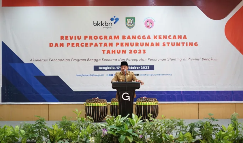 IndonesiaInteraktif.com, Bengkulu -- Wakil Gubernur (Wagub) Bengkulu Rosjonsyah membuka kegiatan Review Program Bangga Kencana dan Percepatan Penurunan Stunting Provinsi Bengkulu Tahun 2023, di Ballroom Hotel Grage Bengkulu, Selasa (17/10/2023). Ketua Tim Percepatan Penurunan Stunting (TPPS) Provinsi Bengkulu ini mengatakan, merupakan PR bersama untuk lebih bekerja keras dalam mencapai target provinsi tahun 2024 menjadi 12,55 persen.