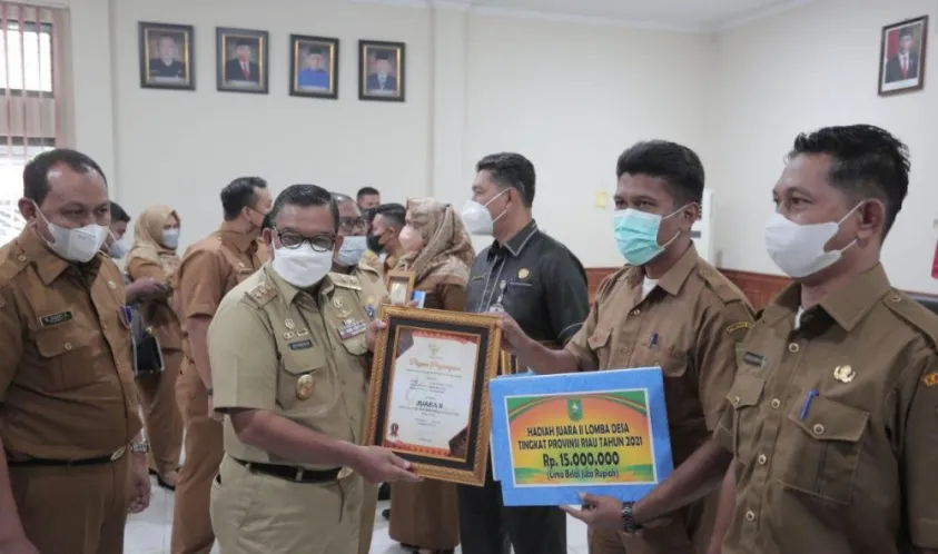Indonesiainteraktif.com, Riau - Wakil Gubernur Riau (Wagubri) Edy Natar Nasution didampingi Plt. Kepala Dinas Pemberdayaan Masyarakat dan Desa (PMD) Dukcapil Provinsi Riau Raja Saspi Kurniawan menyerahkan langsung piagam penghargaan dan bantuan dana pembangunan desa/kelurahan kepada pemenang lomba desa/kelurahan tingkat Provinsi Riau tahun 2021, Selasa (28/12/2021).