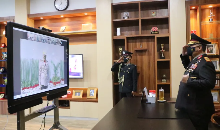 Indonesiainteraktif.com, Bengkulu - Kepala Kepolisian Daerah Bengkulu Irjen. Pol. Drs. Guntur Setyanto, M.Si., mengikuti Upacara Peringatan Hari Kesaktian Pancasila Tahun 2021 secara virtual, Jum’at (01/10/2021). Bertempat di ruang kerjanya, Kapolda terhubung langsung dalam upacara peringatan Hari Kesaktian Pancasila di Monumen Pancasila Sakti, Lubang Buaya, Jakarta yang dipimpin langsung oleh Presiden Joko Widodo.