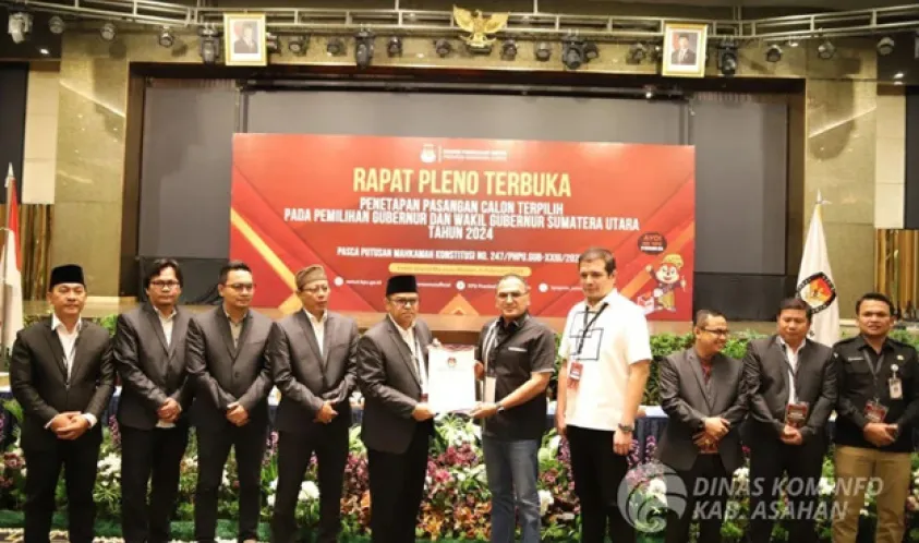 Indonesiainteraktif.com, Asahan -- Komisi Pemilihan Umum (KPU) Provinsi Sumatera Utara (Sumut) menetapkan pasangan nomor urut 1 Bobby Afif Nasution – Surya sebagai Pasangan calon (Paslon) terpilih Gubernur dan Wakil Gubernur Sumut Periode 2025 -2030. Penetapan tersebut setelah KPU Sumut menggelar Rapat Pleno Terbuka Penetapan Pasangan calon (Paslon) terpilih pada Pemilihan Gubernur dan Wakil Gubernur Sumut tahun 2024 yang digelar di Hotel Mercure Jalan Perintis Kemerdekaan, Kota Medan, Provinsi Sumut, Rabu (05/02/2025).