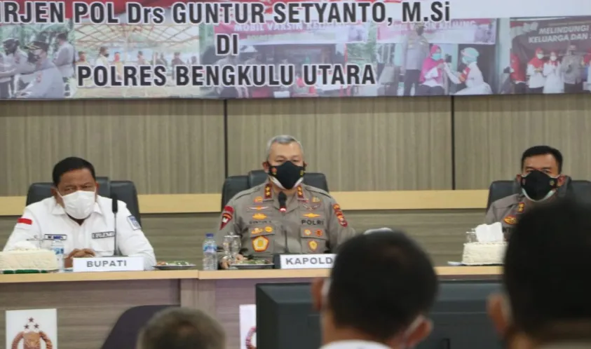 Indonesiainteraktif.com, Bengkulu Utara - Terkait penanganan pandemi Covid-19 serta pelaksanaan vaksinasi di Provinsi Bengkulu. Kapolda Bengkulu Irjen Pol. Drs. Guntur Setyanto, M.Si., laksanakan kunjungan kerja ke Mapolres Bengkulu Utara (BU) Polda Bengkulu, Rabu siang (13/10/2021).