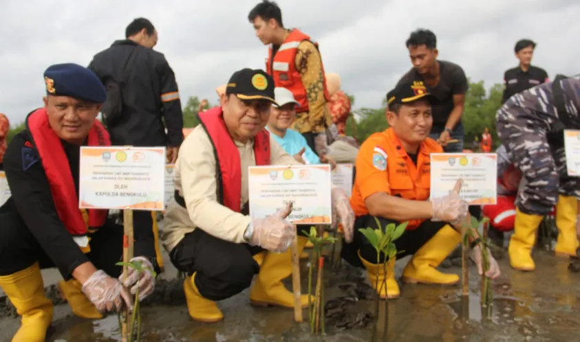 Indonesiainteraktif.com, Bengkulu -- Wujud tanggung jawab dalam menjaga alam Bengkulu, Basarnas Bengkulu, Pemerintah Provinsi Bengkulu, TNI/Polri, Lestari Alam Laut Untuk Negeri (LATUN) Bengkulu serta Instansi lainnya dan para komunitas pemerhati lingkungan, melakukan penanaman pohon mangrove pesisir pantai Bengkulu, yaitu di sekitar kawasan Jenggalu Kito Kota Bengkulu, Senin (27/02/2023).