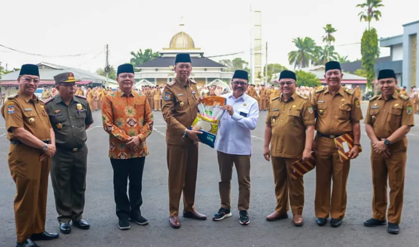 IndonesiaInteraktif.com, Bengkulu -- Gubernur Bengkùlu Rohidin Mersyah menyaksikan penandatanganan secara simbolis perjanjian kerja sama (PKS) antara Perum Bulog Bengkulu dengan Sekretariat Daerah dan OPD Lingkungan Pemprov Bengkulu di halaman apel kantor Gubernur Bengkulu Selasa (10/10/2023) Pagi.