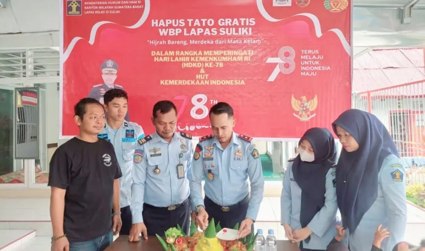Indonesiainteraktif.com, Lima Puluh Kota – Lembaga Pemasyarakatan (Lapas) Kelas III Suliki menggelar kegiatan Hapus Tato yang ke-3 kalinya dalam rangka memperingati Hari Lahir Kementerian Hukum dan Hak Asasi Manusia (Kemenkumham) Republik Indonesia ke-78 Tahun 2023 sekaligus memeriahkan kemerdekaan Indonesia ke-78 Tahun, Selasa (1/8/2023).