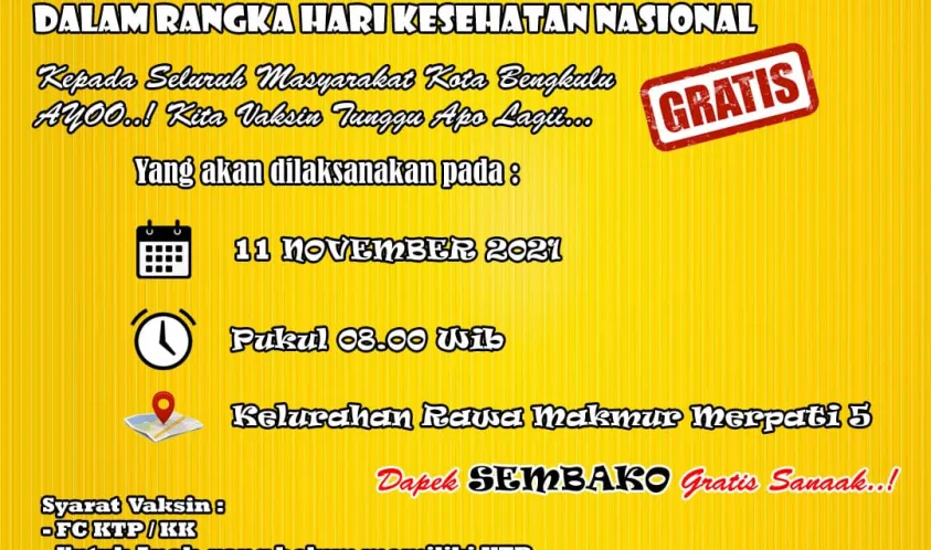 Indonesiainteraktif.com, Bengkulu - Dalam rangka memperingati hari kesehatan Nasional pada 11 November mendatang, Rumah sakit Bhayangkara Polda Bengkulu mengadakan serbuan Vaksinasi massal dan pembagian sembako untuk warga yang mengikuti vaksinasi, bertempat di kelurahan rawa makmur merpati 5 yang akan dilaksanakan pada Kamis pukul 08.00 wib.