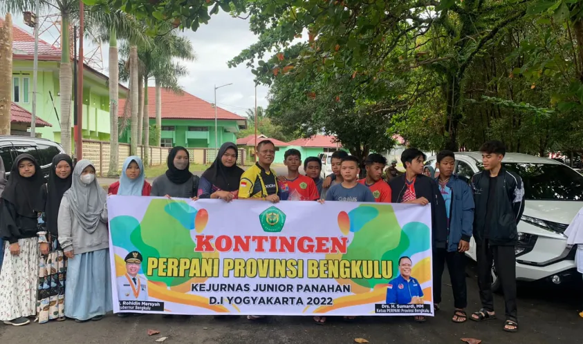 Pelepasan atlet panahan junior dilaksanakan di pelataran lapangan volley GOR Sawah Lebar Kota Bengkulu, Sabtu (15/10/2022), oleh Drs. H. Sumardi, MM, ketua PERPANI Provinsi Bengkulu serta didampingi oleh Ketua KONI Provinsi Bengkulu yang diwakilkan oleh Densi Seketertaris KONI Provinsi Bengkulu, jajaran PERPANI Bengkulu, 16 atlet yang akan diberangkatkan serta orang tua atlet.