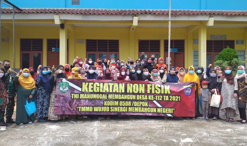 Depok-Kelompok Dosen Vokasi Univeristas Indonesia (UI) bersama Satgas TMMD ke-112 tahun 2021 Kodim Depok memberikan sosialisasi pengelolaan keuangan keluarga kepada puluhan warga RW 05, Kelurahan Pengasinan, Kecamatan Sawangan, Depok, Senin (04/10/21).
