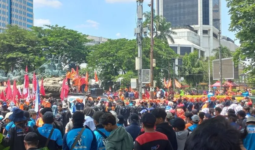 Indonesiainteraktif.com, Jakarta -- Ribuan buruh yang tergabung dalam Partai Buruh, serikat buruh, dan serikat petani menggelar aksi unjuk rasa di dekat patung kuda Indosat Jakarta, Sabtu (14/01/2023).