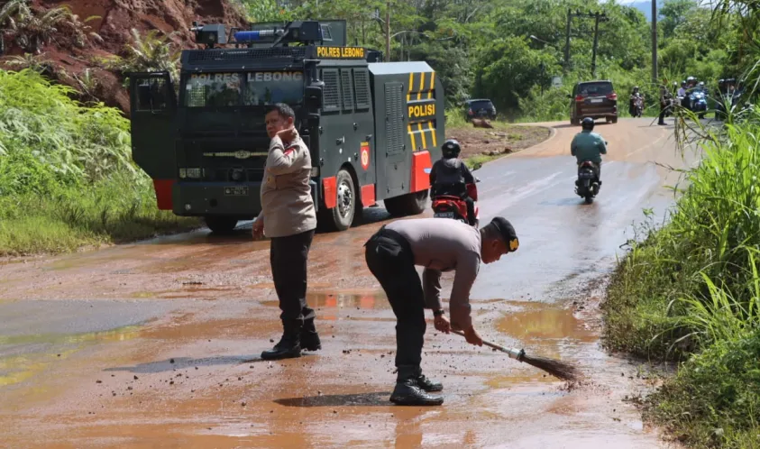 Dipimpin langsung Kasat Samapta Polres Lebong AKP H. Simanungkalit, SE, kegiatan pembersihan badan jalan juga dilakukan Personil Samapta dengan menyapu badan jalan dan mencangkul tanah untuk membuat aliran air terang Ps. Kasubsi PIDM Sie Humas Polres Lebong Polda Bengkulu AIPDA Syaiful Anwar.