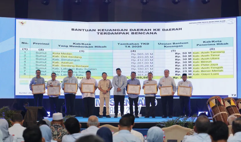 Penghargaan tersebut diberikan atas kontribusi dan partisipasi aktif Pemerintah Kabupaten Asahan dalam memberikan bantuan keuangan kepada Pemerintah Kabupaten Bireuen, Provinsi Aceh, guna mendukung penanggulangan serta pemulihan pascabencana alam tahun 2026. Piagam penghargaan diterima Bupati Asahan, Taufik Zainal Abidin, S.Sos., M.Si, yang hadir bersama Sekretaris Daerah Kabupaten Asahan, Kepala Bapperida beserta jajaran, serta Kepala OPD terkait dengan pelaksanaan Musrenbang Provinsi Sumatera Utara.