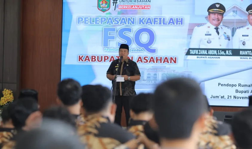 Indonesiainteraktif.com, Asahan - Bupati Asahan, Taufik Zainal Abidin S.Sos, M.Si, secara resmi melepas kontingen Festival Seni Qasidah (FSQ) Kabupaten Asahan untuk mengikuti ajang tingkat Provinsi Sumatera Utara. Acara pelepasan digelar di Aula Pendopo Rumah Dinas Bupati Asahan Jumat (21/11/2025).