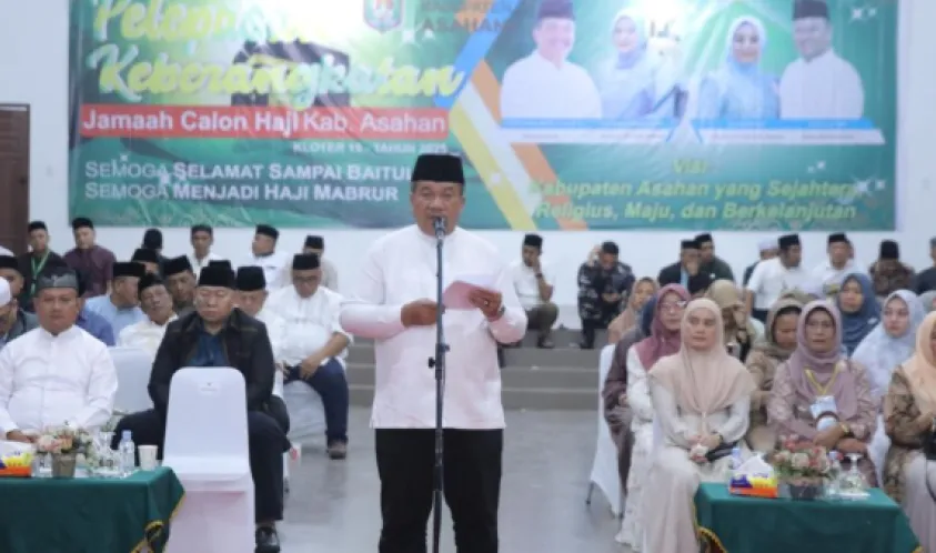 Indonesiainteraktif.com, Asahan -- Bupati Asahan Taufik Zainal Abidin Siregar, S.Sos., M.Si bersama Wakil Bupati Asahan, Rianto, SH., MAP beserta Forkopimda melepas keberangkatan jemaah calon haji Kabupaten Asahan Kloter 15 di Gedung Tahfidz Masjid Agung Haji Achmad Bakrie Kisaran, Senin (19/05/2025) dini hari.