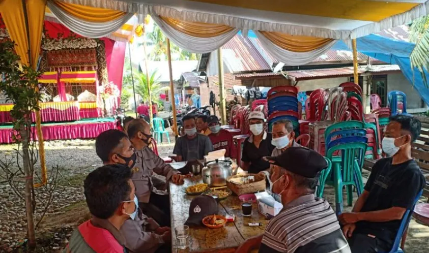 Indonesiainteraktif.com, Seluma - Sinergi bersama sebagai bagian dari Satgas Covid 19 Desa Gelombang Kabupaten Seluma, Anggota Bhabinkamtibmas Polsek Semidang Alas Maras Polres Seluma Bripka Pipin Apriadi dan Briptu Ferry Kurniawan melakukan pemberian himbauan kepada warga yang akan melaksanakan keramaian berupa hajatan atau resepsi pernikahan, Jumat (24/09/2021).
