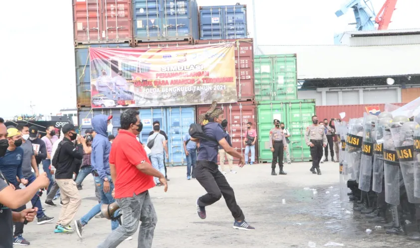 Inilah skenario yang dibuat dan dijalankan saat simulasi yang digelar Polda Bengkulu di Pelabuhan Pelindo Pulau Baai Kota Bengkulu saat menghadapi aksi massa dimulai dengan menurunkan Tim Negosiasi Polwan (Polisi Wanita) dilanjutkan Pleton Dalmas Samapta hingga terpaksa menurunkan Tim Pengendali Huru Hara dari Sat Brimobda untuk mengatasi aksi dilapangan yang kurang kondusif.