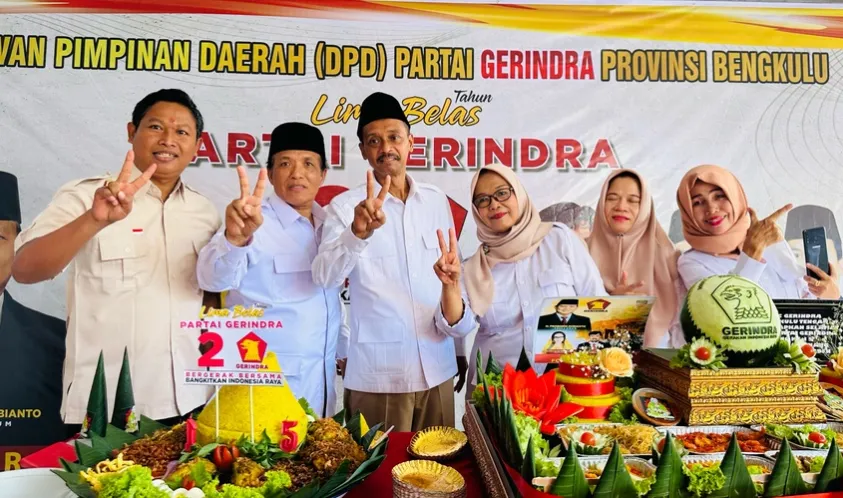 Indonesiainteraktif.com, Bengkulu -- Setelah mengikuti Hari Ulang Tahun (HUT) Partai Gerindra ke-15 yang dipusatkan di Kantor Dewan Pimpinan Pusat (DPP) Partai Gerindra, Jakarta yang dilaksanakan secara virtual oleh seluruh DPD dan DPC se-Indonesia pada Senin 6/2/2003), secara khusus, DPD Partai Gerindra Provinsi Bengkulu merayakan HUT Partai Gerindra secara sederhana di Sekretariat DPD Partai Gerindra Provinsi Bengkulu, Jalam Raden Patah, RT. 9 No. 7, Sumur Dewa, Selebar, Kota Bengkulu pada Sabtu (18/2/2023).