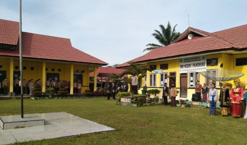 Indonesiainteraktif.com, Mukomuko - Bertindak sebagai Pembina Upacara dalam rangka memperingati Hari Sumpah Pemuda ke 93 yang digelar SMKN 3 Mukomuko, Kamis (28/10/2021), Anggota Bhabinkamtibmas Polsek Mukomuko Utara AIPTU Mulyadi memberikan himbauan tentang prokes.