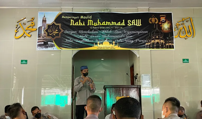 Indonesiainteraktif.com, Rejang Lebong - Polres Rejang Lebong menggelar acara Maulid nabi Muhamad SAW 1443 H/2021 M di Masjid Al-Waliyyul Khobir Polres Rejang Lebong, Jumat (29/10/2021).