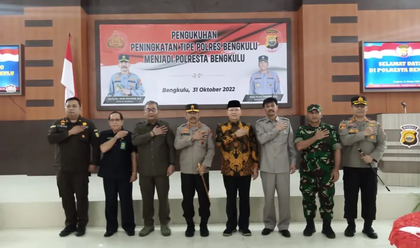 Indonesiainteraktif.com, Bengkulu -- Pagi ini Senin (31/10/2022), Kepolisian Resor (Polres) Bengkulu dikukuhkan menjadi Kepolisian Resor Kota (Polresta) Bengkulu. Pengukuhan kenaikan tipe dilakukan oleh Kapolda Bengkulu Irjen Pol Agung Wicaksono di Mapolresta Bengkulu. Tampak hadir dalam acara pengukuhan tersebut Gubernur Bengkulu Rohidin Mersyah dan Wakil Ketua DPRD Provinsi Bengkulu yang juga Ketua DPD Partai Gerindra Provinsi Bengkulu Suharto beserta tamu undangan lainnya.