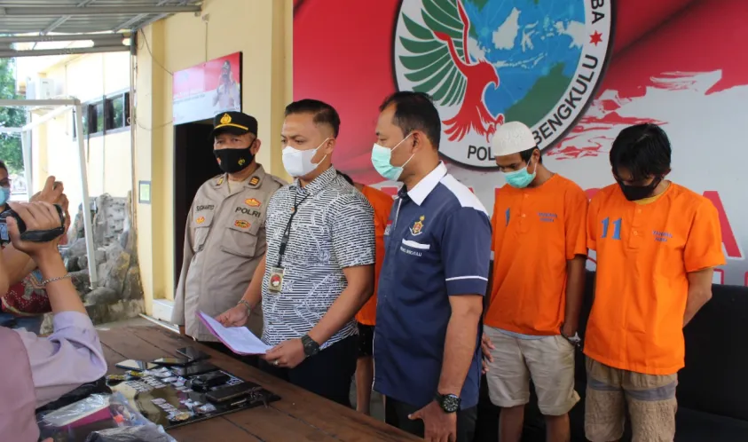 Indonesiainteraktif.com, Bengkulu - Sat Res Narkoba Polres Bengkulu Polda Bengkulu menggelar konferensi pers dengan awak media massa dalam rangka pengungkapan kasus penyalahgunaan narkoba jenis sabu di Polres Bengkulu, Jum’at (15/10/2021).