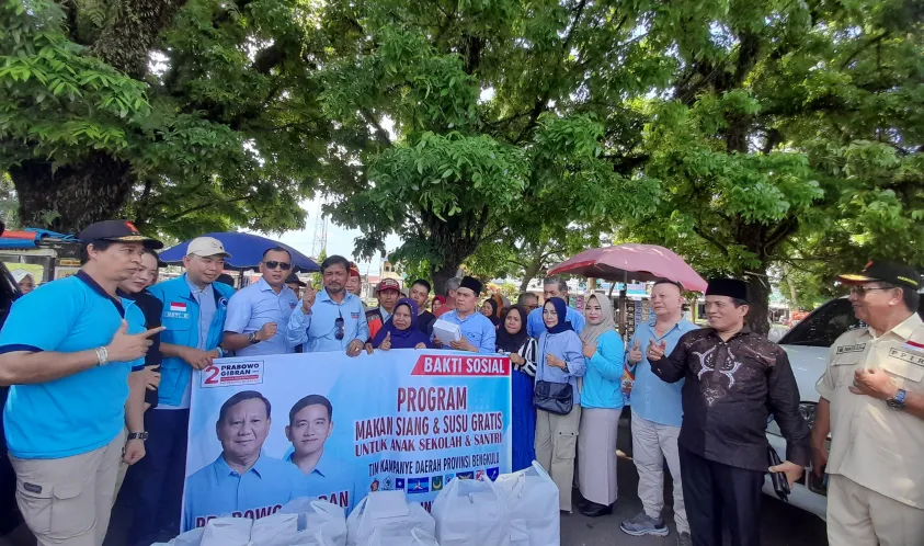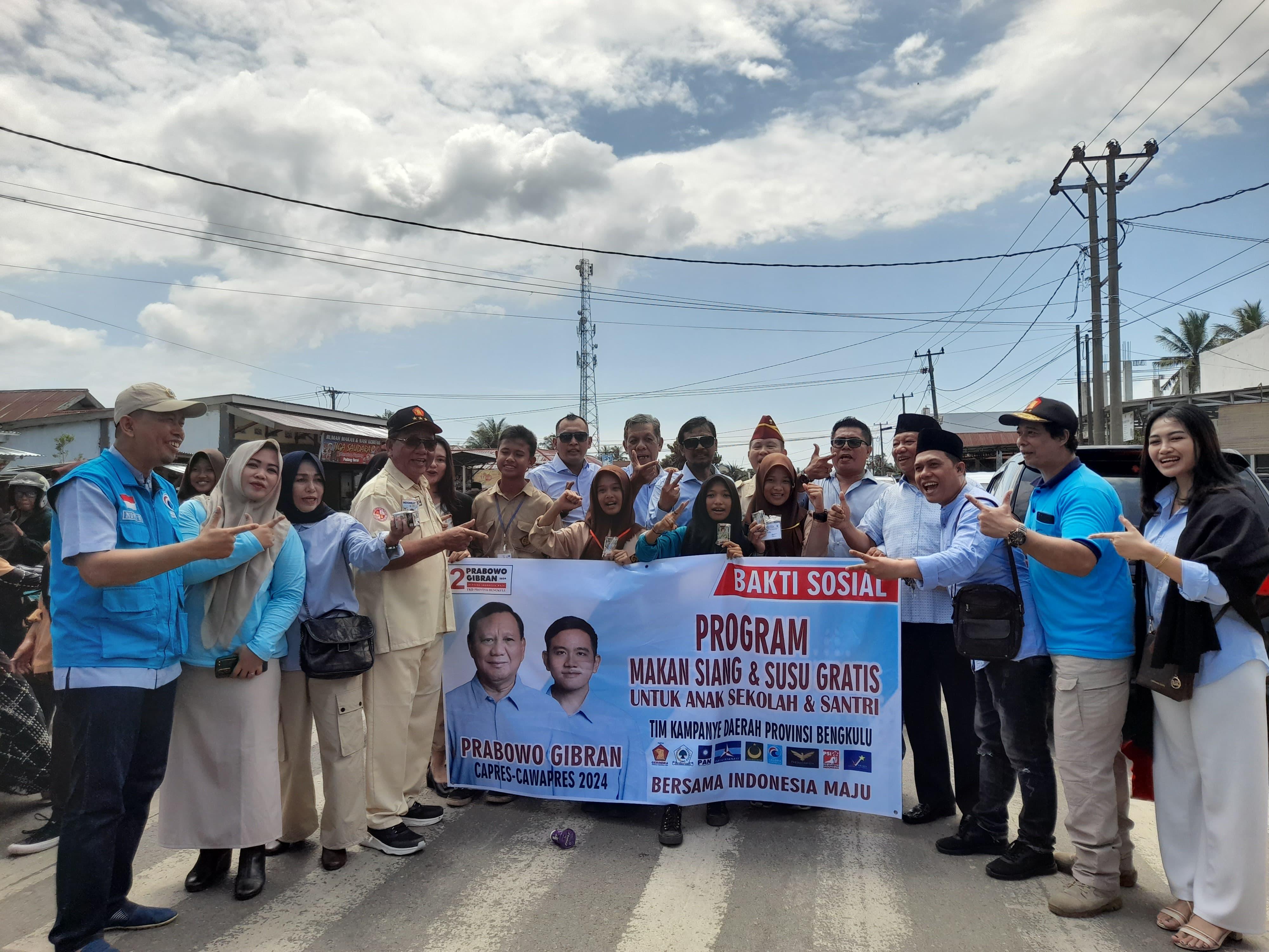 IndonesiaInteraktif.com, Bengkulu -- Dalam rangkaian kampanye pemilihan presiden (pilpres) tahun 2024, Tim Kampanye Daerah (TKD) Prabowo-Gibran Provinsi Bengkulu menggelar Program Makan Siang dan Minum Susu bagi Anak Sekolah dan Pesantren, Serta Bantuan Gizi untuk Anak, Balita, dan Ibu Hamil pada Rabu (29/11/2023) di Kelurahan Padang Serai, Kota Bengkulu.