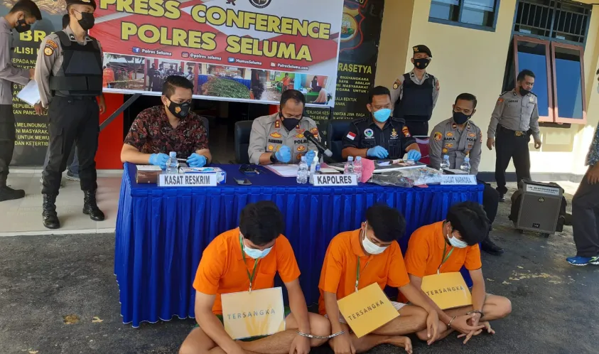 Jumat (01/10/2021) Sat Resnarkoba polres Seluma berhasil mengamankan 3 orang tersangka TSA (24), DP (21), dan JS (28) atas kasus tindak pidana tanpa hak dan melawan hukum penyalahgunaan narkotika golongan 1 jenis sabu di Desa Talang Kabu Kecamatan Ilir Talo.