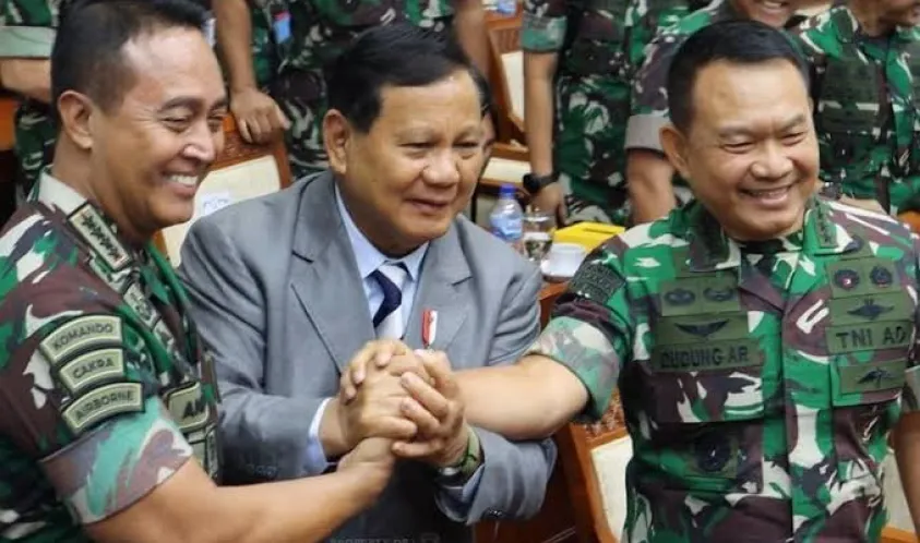 Indonesiainteraktif.com, Jakarta -- Wibawa Menteri Pertahanan Letjen TNI (Purn) Prabowo Subianto yang saat ini dicalonkan Partai Gerindra dan Partai Kebangkitan Bangsa (PKB) sebagai calon Presiden sungguh luar biasa. Dalam Rapat Dengar Pendapat (RDP) dengan Komisi I DPR RI, Menhan Prabowo menyaksikan dan ikut menangkupkan tangan Panglima TNI Jenderal TNI Andika Perkasa dan Kasad Jenderal TNI Dudung Abdurrachman, Senin (26/9/2022).