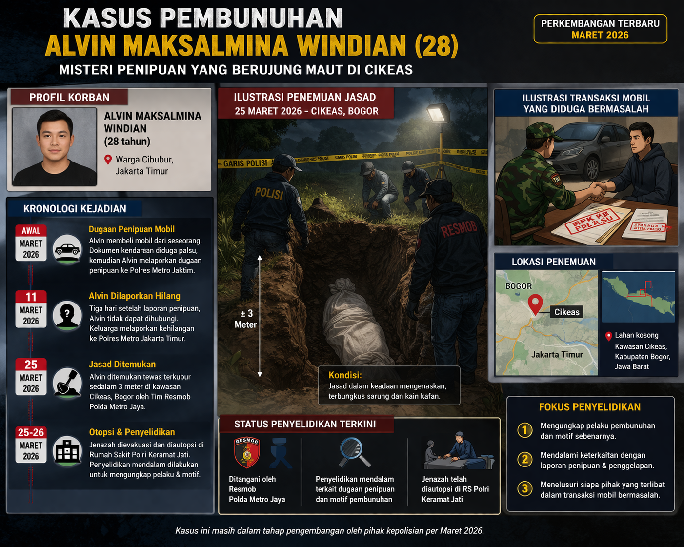 Indonesiainteraktif.com, Jakarta Timur - Misteri Misteri hilangnya seorang pria asal Cibubur, Jakarta Timur, akhirnya terungkap dengan temuan tragis. Alfin Maksalmina Windian (28), yang dilaporkan hilang sejak 11 Maret 2026, ditemukan dalam kondisi meninggal dunia dan terkubur di lahan kosong kawasan Cikeas, Kabupaten Bogor, pada Rabu malam (25/3).