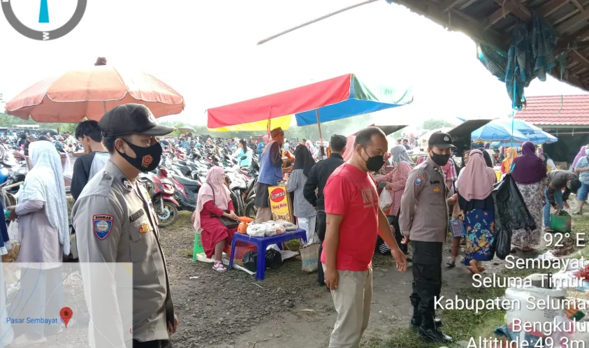 Indonesiainteraktif.com, Seluma - Sambang Pasar Induk Seluma yang berada di Kelurahan Sembayat Kecamatan Seluma Timur, Anggota Polsek Seluma Polda Bengkulu pagi memberikan himbauan harkamtibmas disertai kepatuhan protokol kesehatan (prokes), Minggu (28/11/2021).